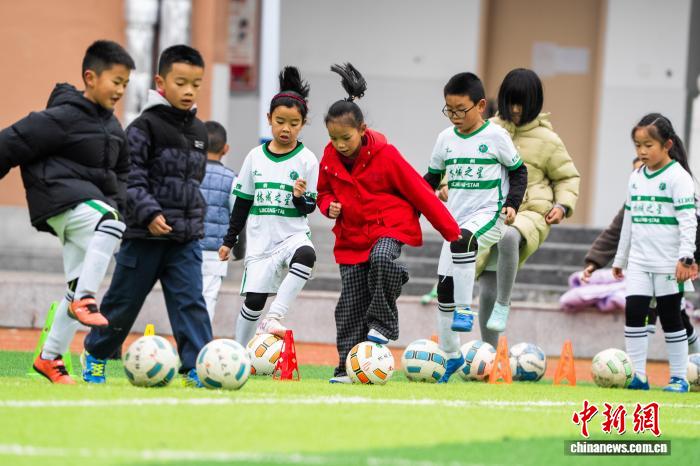 今日正在贵州省毕节市实行黉舍脚球场上,儿童们正在教员的请问放学习脚球 。罗年夜富 摄